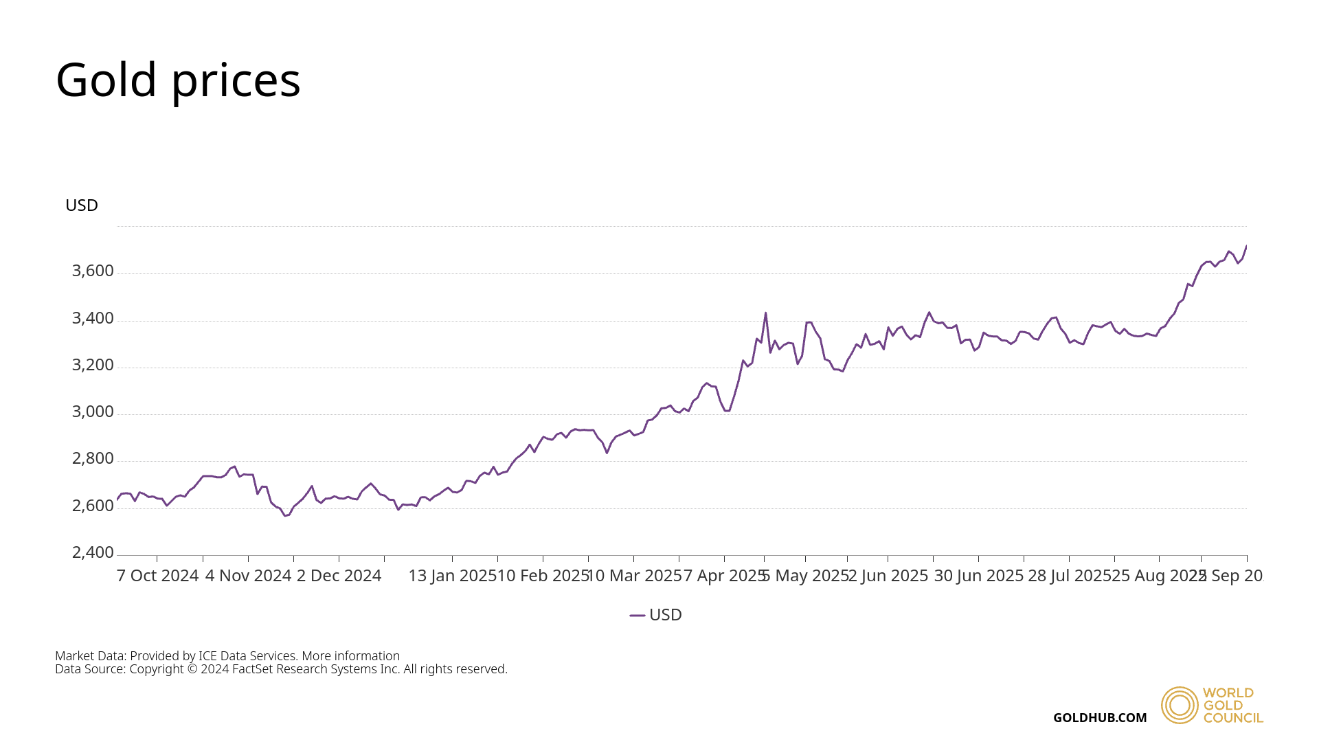This data set provides the gold price averages from September 23, 2024 to September 22, 2025.Source: www.gold.org