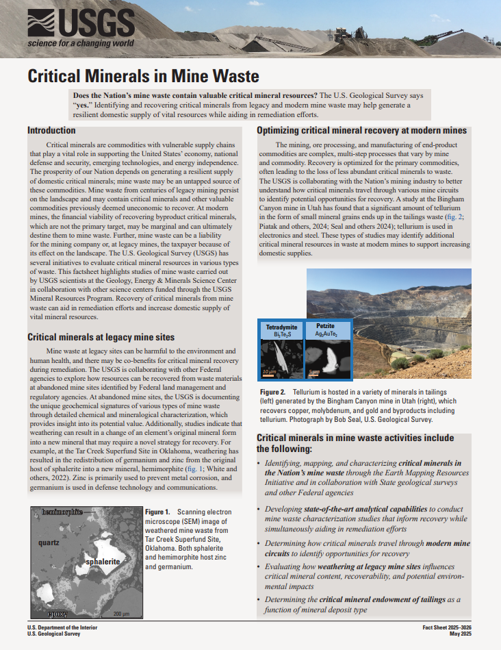 "Does the Nation’s mine waste contain valuable critical mineral resources? The U.S. Geological Survey says “yes.” Identifying and recovering critical minerals from legacy and modern mine waste may help generate a resilient domestic supply of vital resources while aiding in remediation efforts."Source: www.usgs.gov